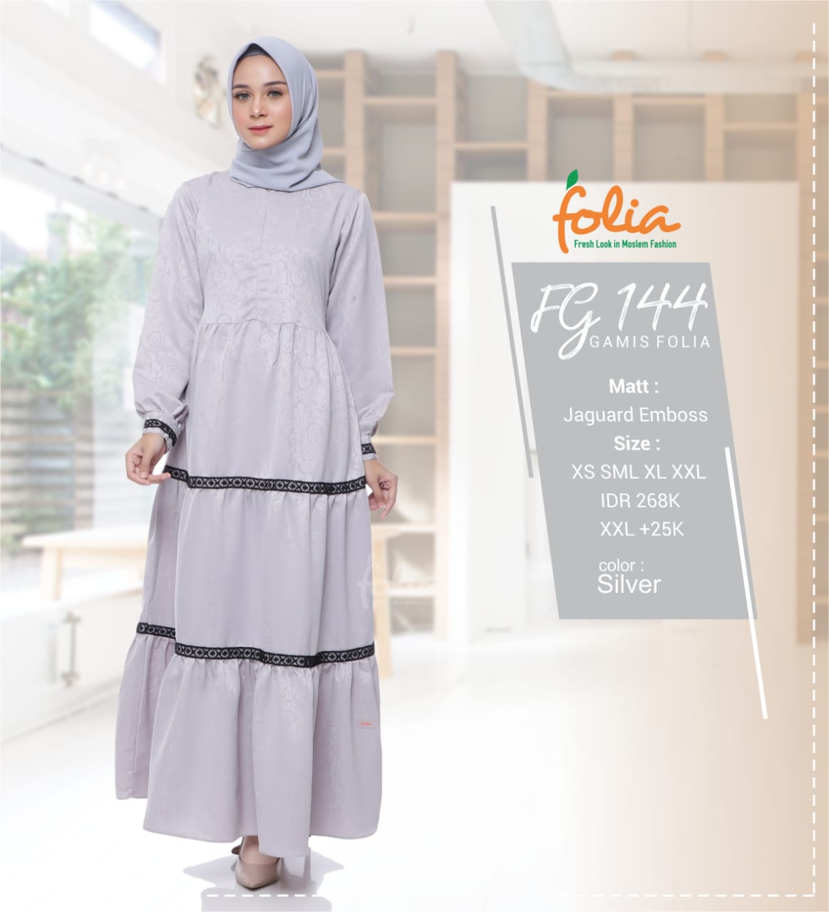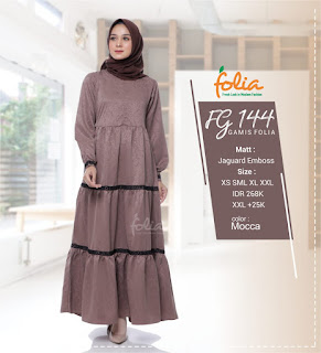 Koleksi Gamis Terbaru Folia FG 144,  untuk anda yg ingin tampil syar'i, modis dengan design gamis simple motif namun terlihat modern & cantik. Dengan bahan yg dijamin kualitasnya.